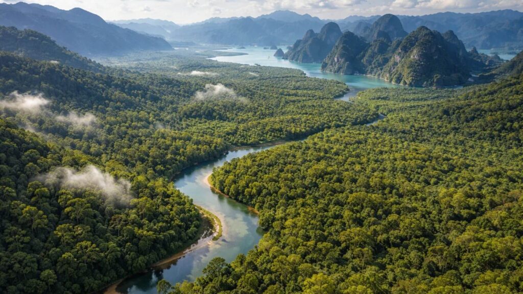A Floresta de Sumatra, na Indonésia, estende-se por cerca de 250.000 quilômetros quadrados e é lar de uma biodiversidade excepcional, com mais de 10.000 espécies de plantas, 201 mamíferos e 580 aves, incluindo tigres e elefantes ameaçados.