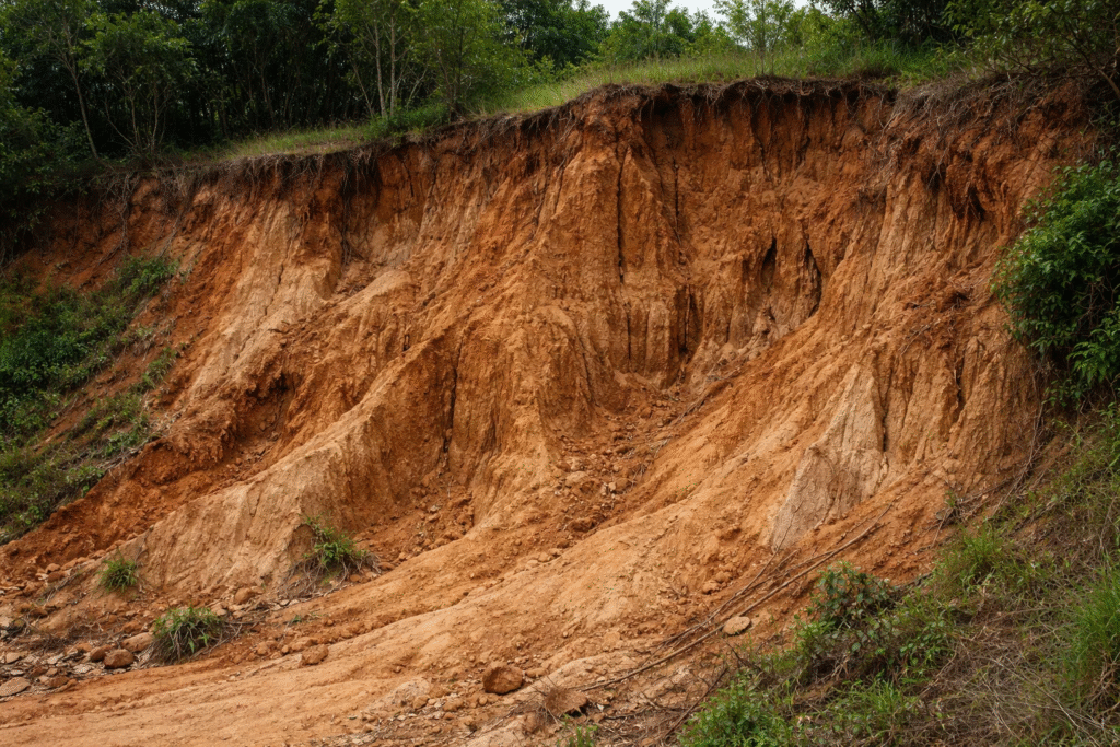 Em outro cenário, como uma encosta com solo exposto e erosão, o reflorestamento pode até ajudar a segurar o solo, mas, se mal planejado, não resolve o problema estrutural.